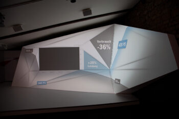 Presentation with mapping on polygonal stage elements, integration of keynote content into structure. Small setup for app. 20 spectators.