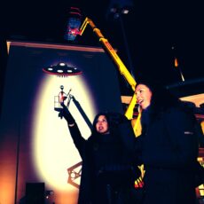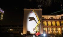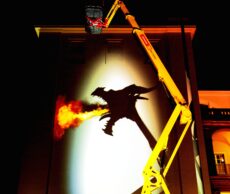 It seemed that there was just a shadow of a cherry picker. But now and then, passerbys were surprised by several illusionist animations. Transforming the shadow into a dragon, an alien, or a giant saw. Sometimes very shocking for the viewers, always very funny for us.