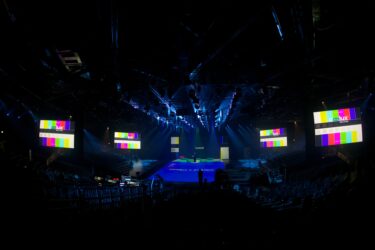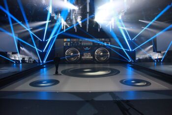 Marketing event with 4,000 spectators, interactive high-resolution floor projection on an angled staged. Presentations, films and fashion shows.