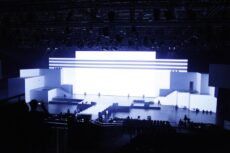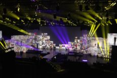 Set Up: The stage spanned 50 meters, with a central stereoscopic main screen and 2D projections on architectural cubes.